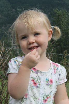 Ava gathered raspberry after raspberry in her little green tub. Heidi, on the other hand, prefers the "eat as you go" method of raspberry picking...